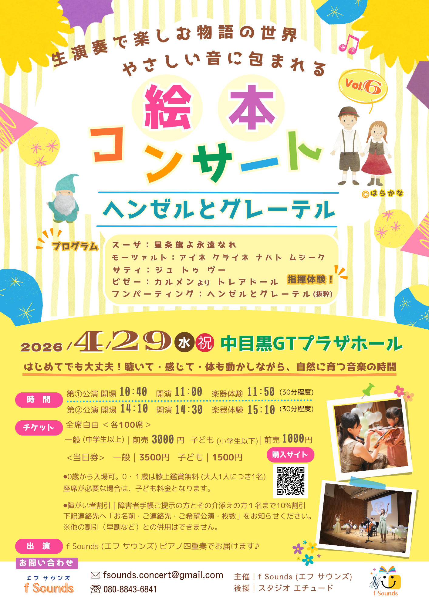 世界の名作「ヘンゼルとグレーテル」とクラシックの名曲を、生演奏で楽しめる絵本コンサートです。ヴァイオリン・ヴィオラ・チェロ・ピアノのやさしい音色とプロの語りが重なり、はじめての方でも安心して楽しめる内容となっています。
